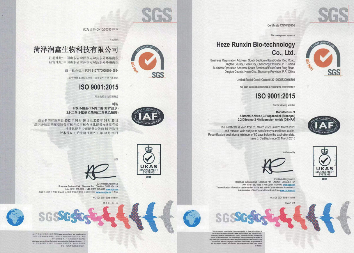 工廠自2002年開始生產工業殺菌防腐劑、水處理化學品、醫藥中間體。殺菌劑系列產品主要有二溴氰乙酰胺(又名DBNPA)、溴硝醇(又名布羅波爾)等,醫藥中間體有氰乙酰胺及甾體激素類產品,同時供應食品添加劑和動物保護產品。工廠于2005年通過ISO質量體系認證,擁有完整的生產線,液相、氣相等完備的檢測設備,實行嚴格的質量控制,產品深受客戶認可。